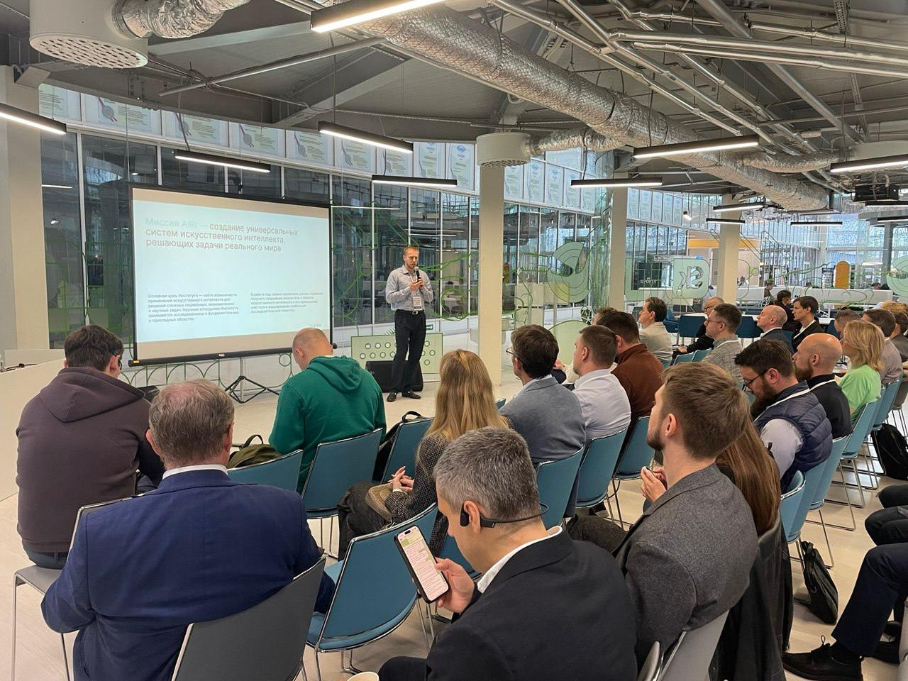 Евгений Бурнаев, руководитель Центра ИИ Сколтеха, представил ряд прикладных решений инновационного центра: от анализа пространственных данных и мониторинга техногенных рисков до оптимизации производственных процессов и работы с нормативной документацией.